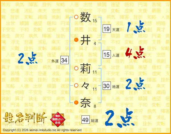 数(15画)井(4画) 莉(11画)々(11画)奈(8画)