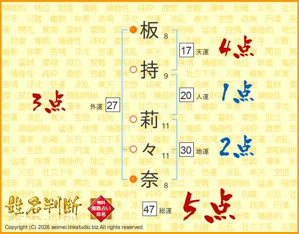 板(8画)持(9画) 莉(11画)々(11画)奈(8画)