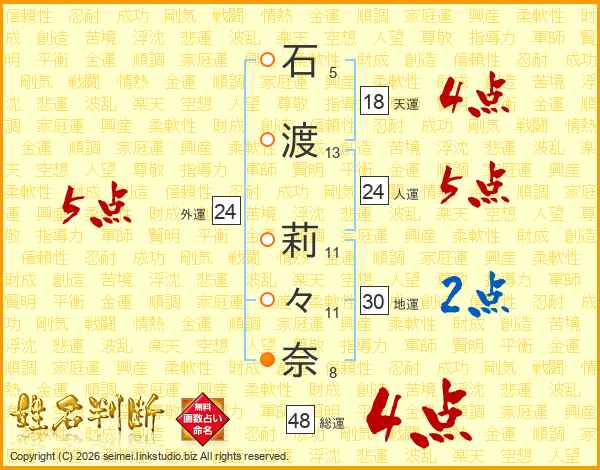 石(5画)渡(13画) 莉(11画)々(11画)奈(8画)