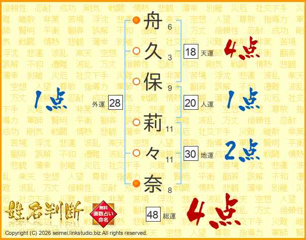 舟(6画)久(3画)保(9画) 莉(11画)々(11画)奈(8画)