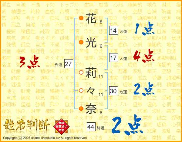 花(8画)光(6画) 莉(11画)々(11画)奈(8画)