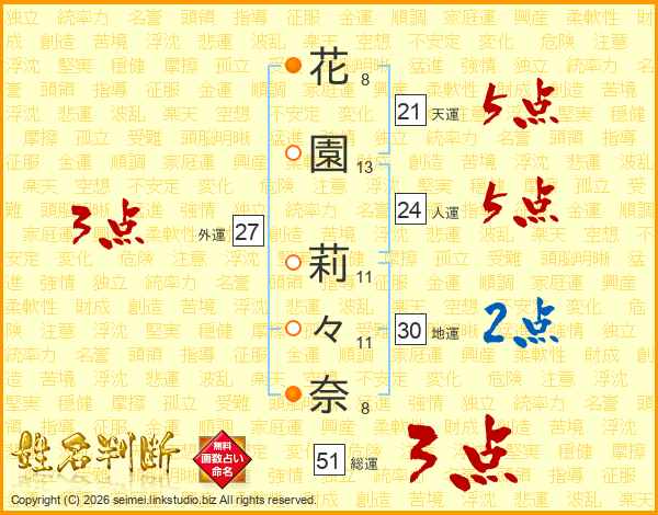 花(8画)園(13画) 莉(11画)々(11画)奈(8画)