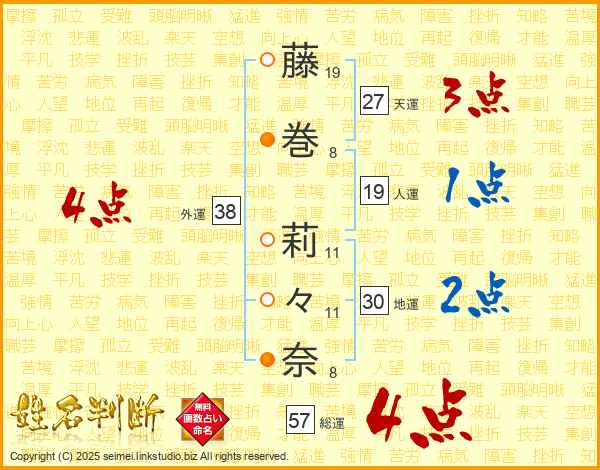 藤(19画)巻(8画) 莉(11画)々(11画)奈(8画)
