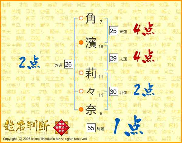 角(7画)濱(18画) 莉(11画)々(11画)奈(8画)