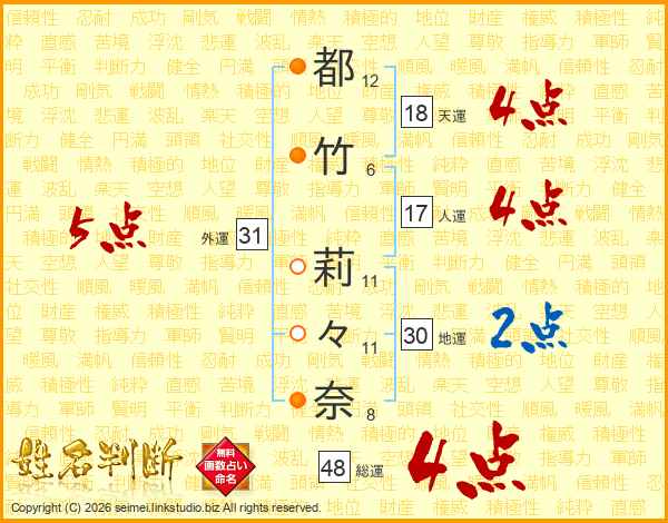 都(12画)竹(6画) 莉(11画)々(11画)奈(8画)