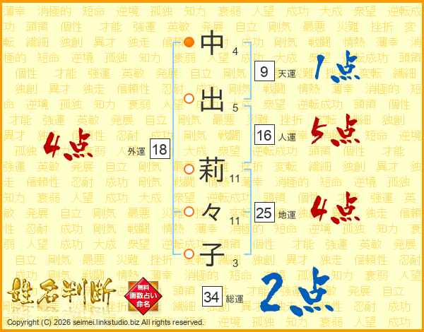 中(4画)出(5画) 莉(11画)々(11画)子(3画)