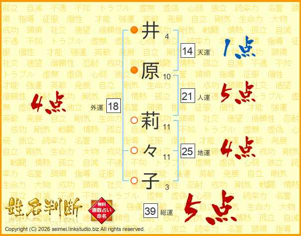 井原莉々子さんの総運は39画の5点!