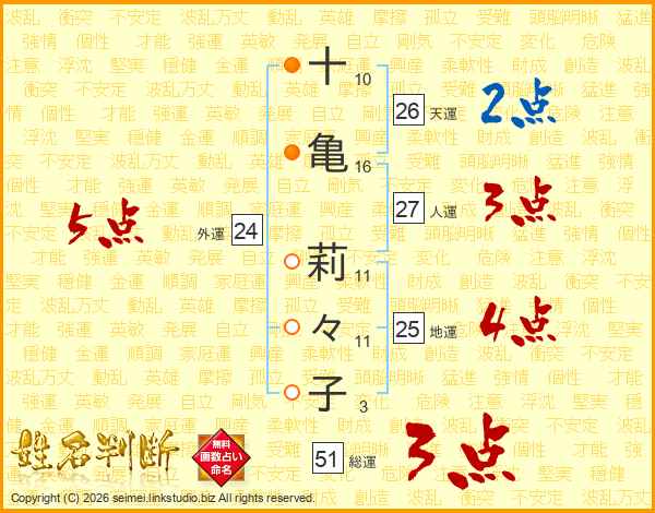 十(10画)亀(16画) 莉(11画)々(11画)子(3画)