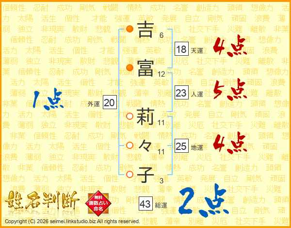 吉(6画)富(12画) 莉(11画)々(11画)子(3画)