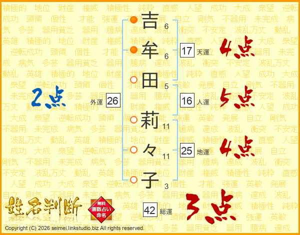吉(6画)牟(6画)田(5画) 莉(11画)々(11画)子(3画)
