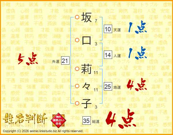 坂(7画)口(3画) 莉(11画)々(11画)子(3画)