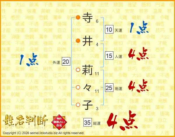 寺(6画)井(4画) 莉(11画)々(11画)子(3画)