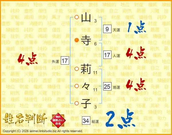 山寺莉々子さんの総運は34画の2点!