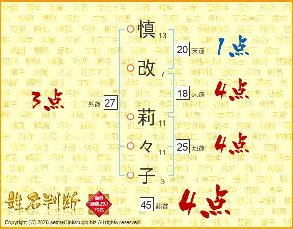 慎(13画)改(7画) 莉(11画)々(11画)子(3画)