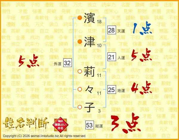 濱(18画)津(10画) 莉(11画)々(11画)子(3画)