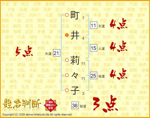 町(7画)井(4画) 莉(11画)々(11画)子(3画)