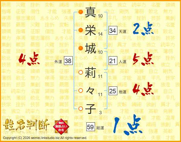真(10画)栄(14画)城(10画) 莉(11画)々(11画)子(3画)