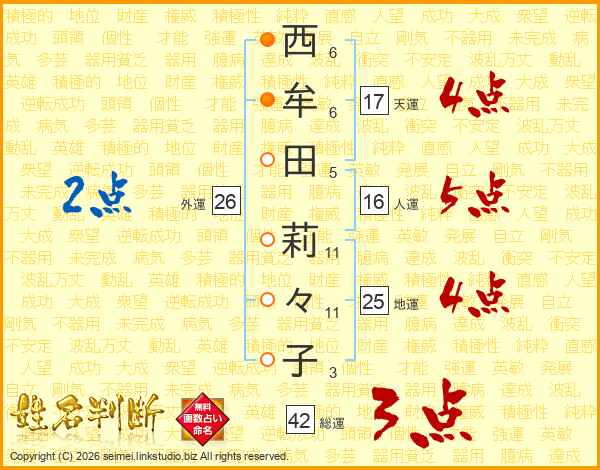 西(6画)牟(6画)田(5画) 莉(11画)々(11画)子(3画)