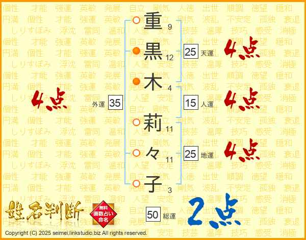 重(9画)黒(12画)木(4画) 莉(11画)々(11画)子(3画)