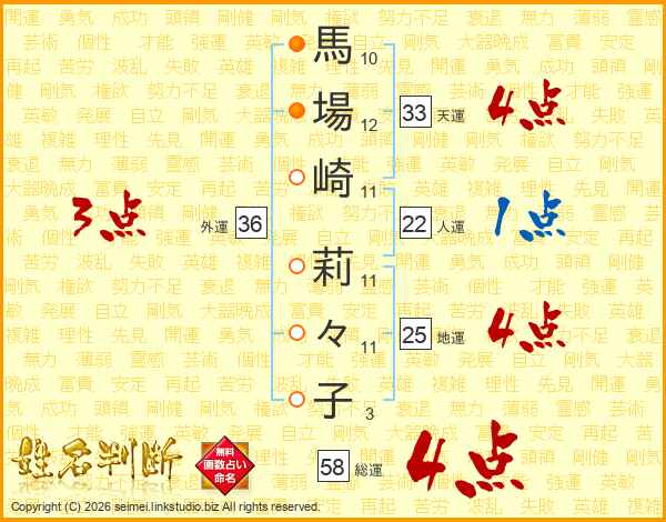 馬(10画)場(12画)崎(11画) 莉(11画)々(11画)子(3画)