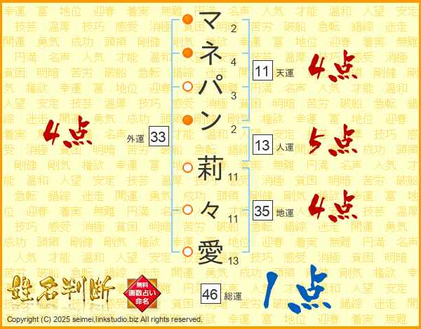 マ(2画)ネ(4画)パ(3画)ン(2画) 莉(11画)々(11画)愛(13画)