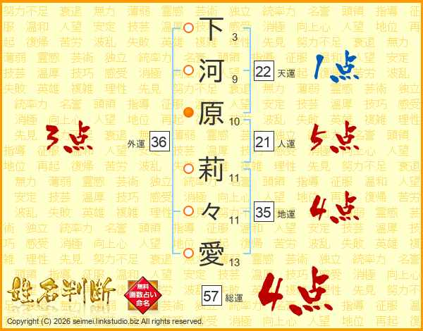 下(3画)河(9画)原(10画) 莉(11画)々(11画)愛(13画)