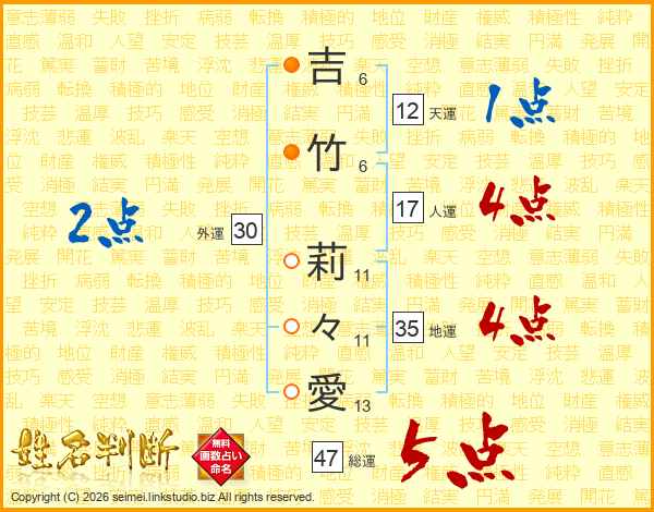 吉(6画)竹(6画) 莉(11画)々(11画)愛(13画)
