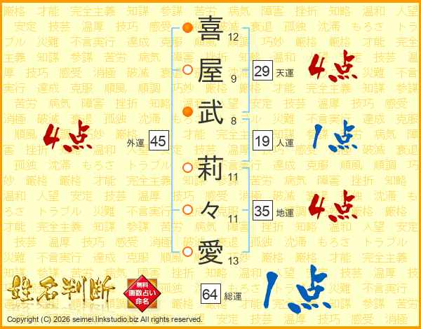 喜(12画)屋(9画)武(8画) 莉(11画)々(11画)愛(13画)