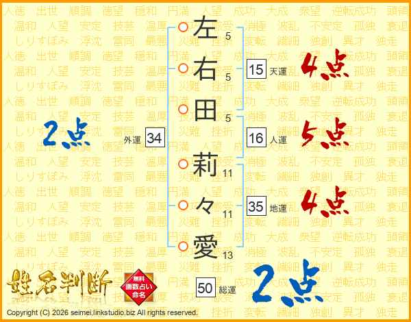 左(5画)右(5画)田(5画) 莉(11画)々(11画)愛(13画)