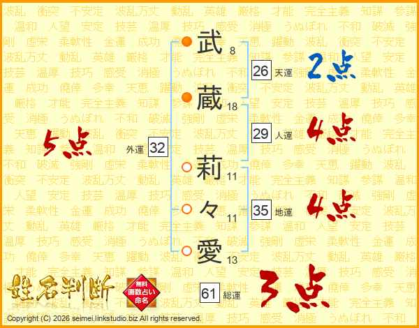 武(8画)蔵(18画) 莉(11画)々(11画)愛(13画)