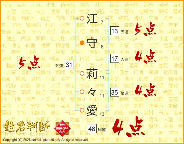 江(7画)守(6画) 莉(11画)々(11画)愛(13画)