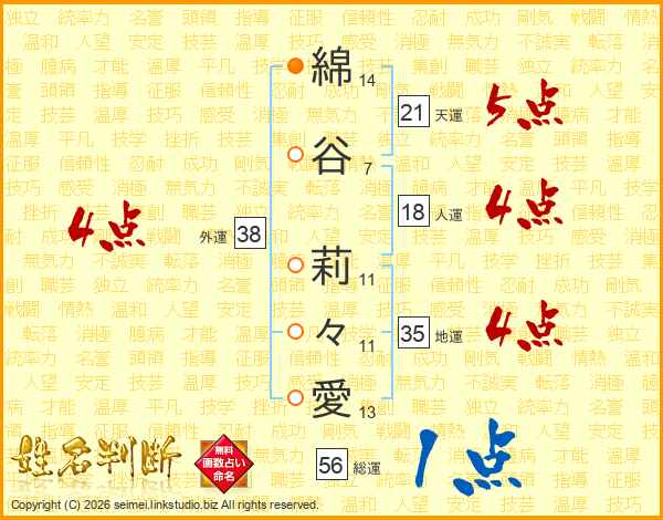 綿谷莉々愛さんの外運は38画の4点!
