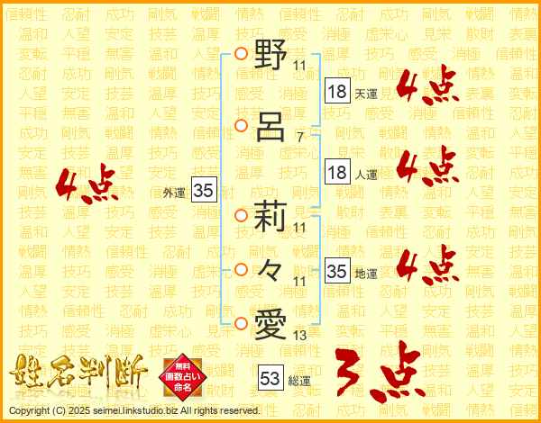 野(11画)呂(7画) 莉(11画)々(11画)愛(13画)