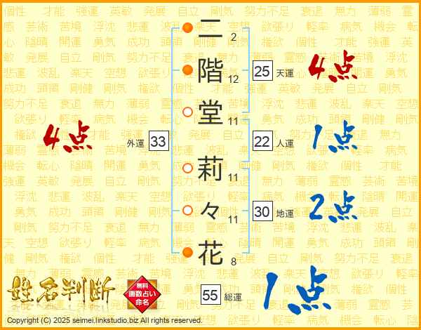 二(2画)階(12画)堂(11画) 莉(11画)々(11画)花(8画)