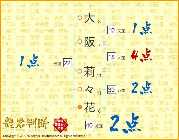 大阪莉々花さんの総運は40画の2点!