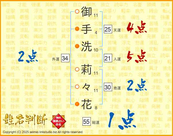 御手洗莉々花さんの総運は55画の1点!