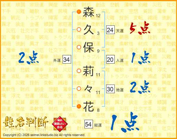 森(12画)久(3画)保(9画) 莉(11画)々(11画)花(8画)