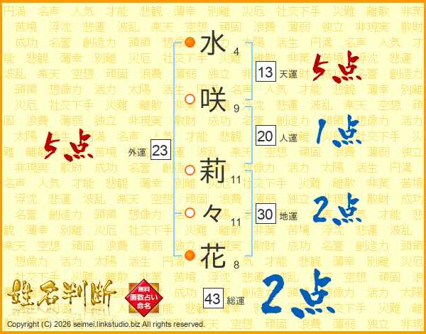 水(4画)咲(9画) 莉(11画)々(11画)花(8画)