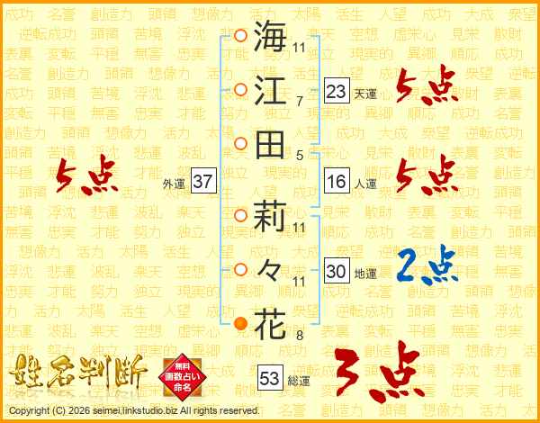 海(11画)江(7画)田(5画) 莉(11画)々(11画)花(8画)