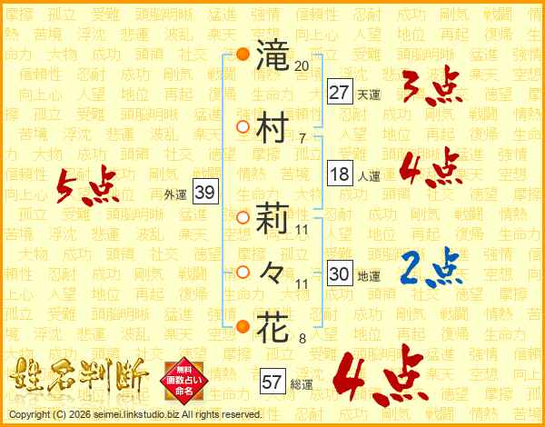 滝(20画)村(7画) 莉(11画)々(11画)花(8画)