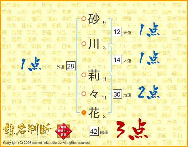 砂(9画)川(3画) 莉(11画)々(11画)花(8画)