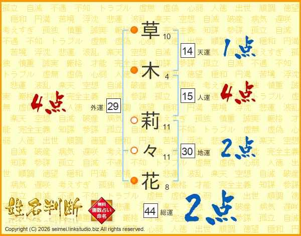 草(10画)木(4画) 莉(11画)々(11画)花(8画)