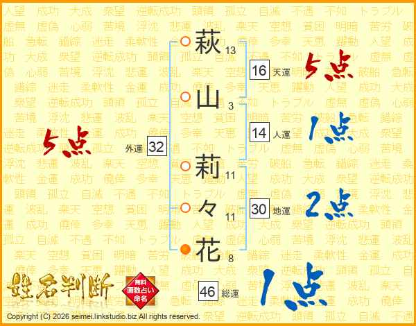 萩(13画)山(3画) 莉(11画)々(11画)花(8画)