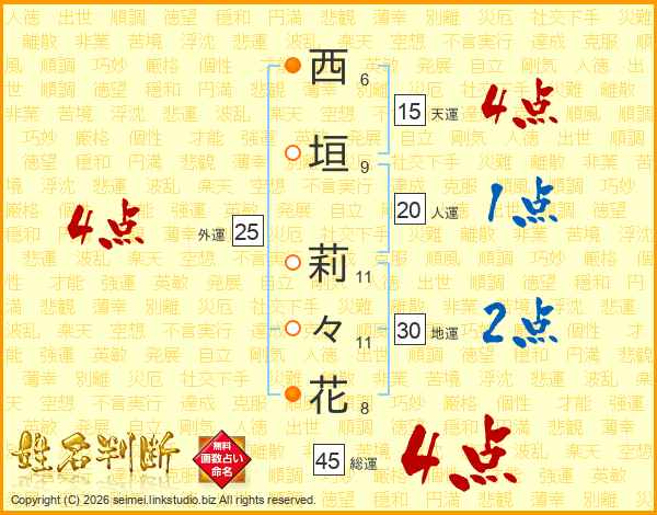 西(6画)垣(9画) 莉(11画)々(11画)花(8画)