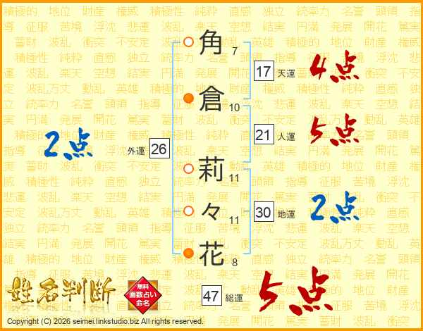 角(7画)倉(10画) 莉(11画)々(11画)花(8画)