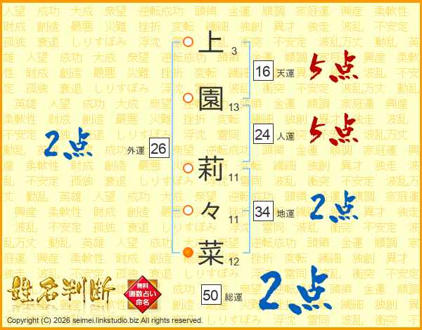上園莉々菜さんの天運は16画の5点!