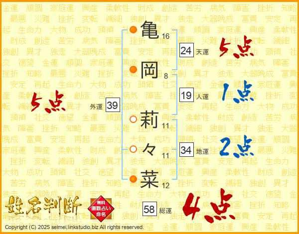亀(16画)岡(8画) 莉(11画)々(11画)菜(12画)