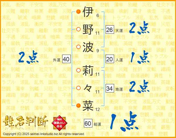 伊(6画)野(11画)波(9画) 莉(11画)々(11画)菜(12画)