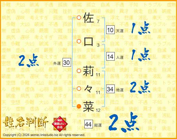 佐(7画)口(3画) 莉(11画)々(11画)菜(12画)