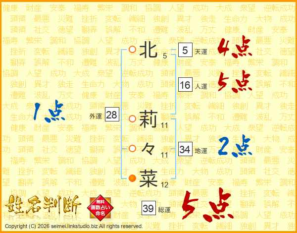 北莉々菜さんの総運は39画の5点!